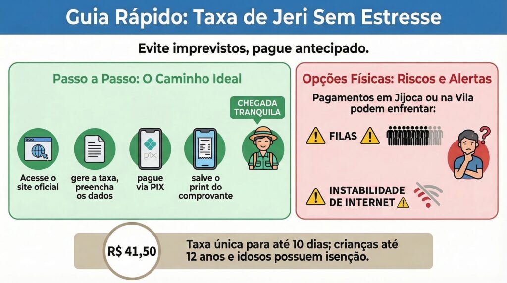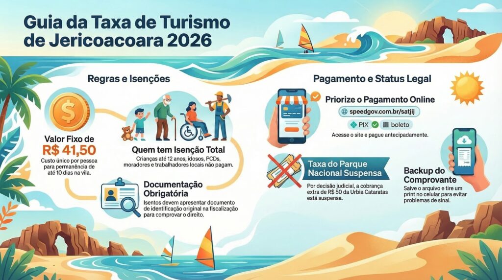 Resumo para o seu planejamento: Em março de 2026, a ÚNICA taxa obrigatória para visitar Jericoacoara é a Taxa de Turismo Sustentável (TTS) de R$ 41,50 por pessoa, cobrada pela Prefeitura de Jijoca. A taxa do Parque Nacional está SUSPENSA por decisão judicial.